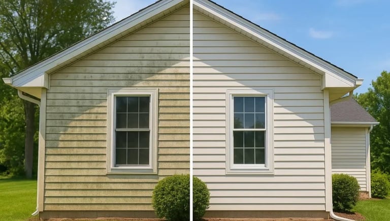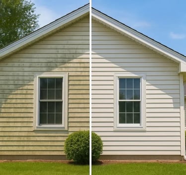 Safe, low-pressure exterior cleaning that removes algae, mold, dirt, and organic buildup from siding. This process restores curb appeal and helps protect your home’s exterior surfaces from long-term damage.