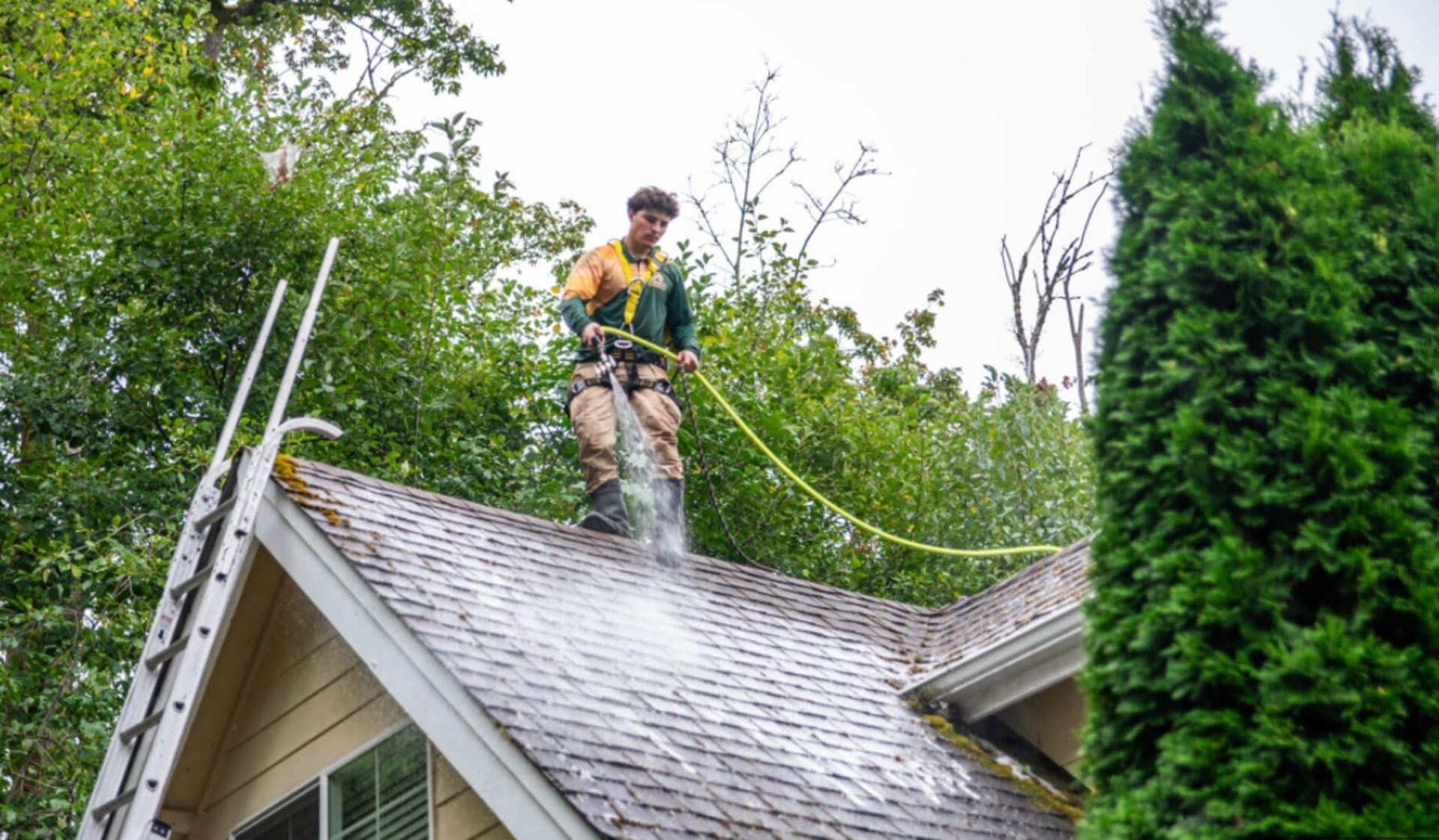 Our roof soft washing service uses controlled low-pressure application methods to safely remove organic buildup while protecting shingle integrity. This professional cleaning process restores the natural color of your roof and helps improve the balance and presentation of your entire exterior. As a licensed and insured company, ShoreBright Exteriors ensures proper treatment methods and dependable results for every project.